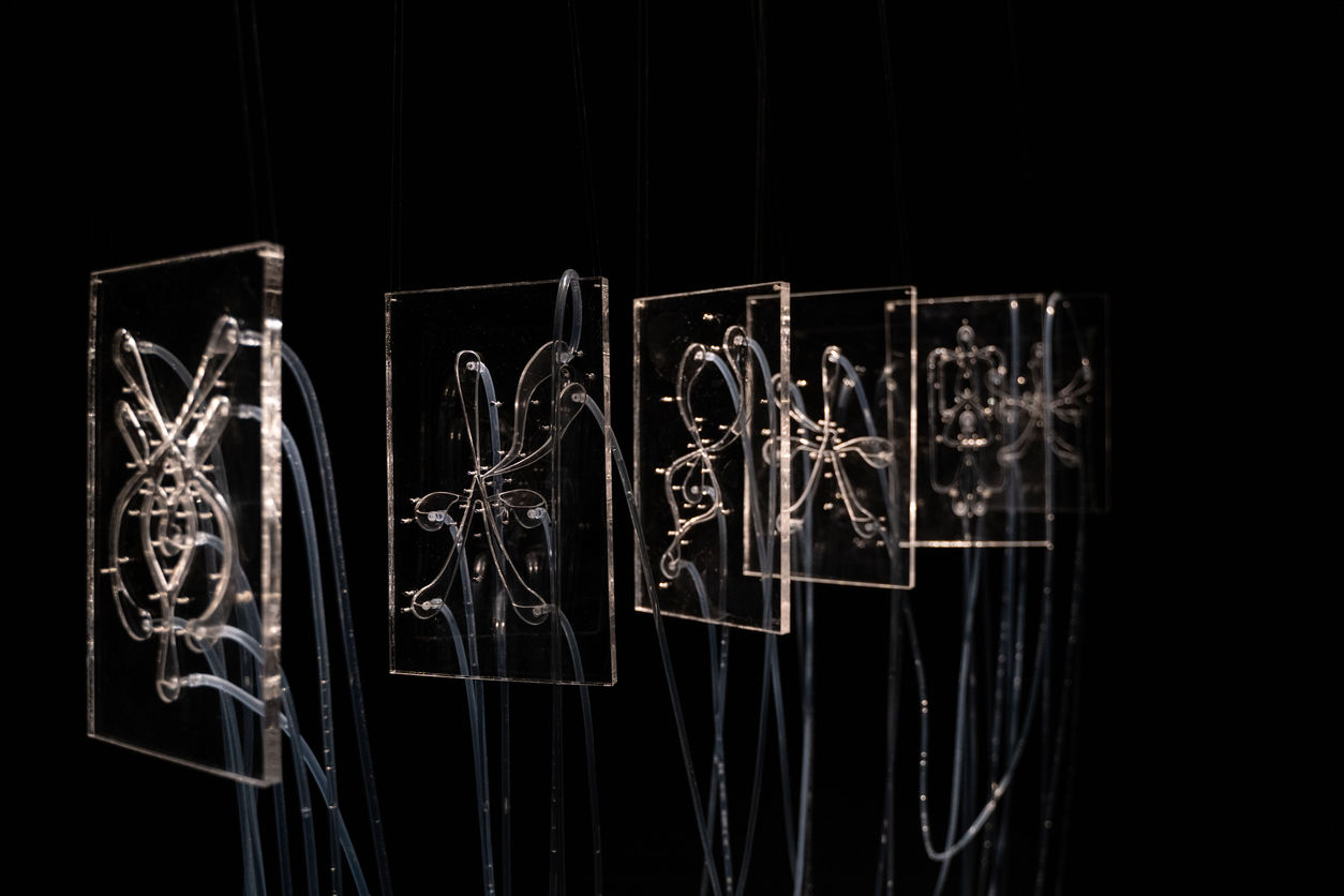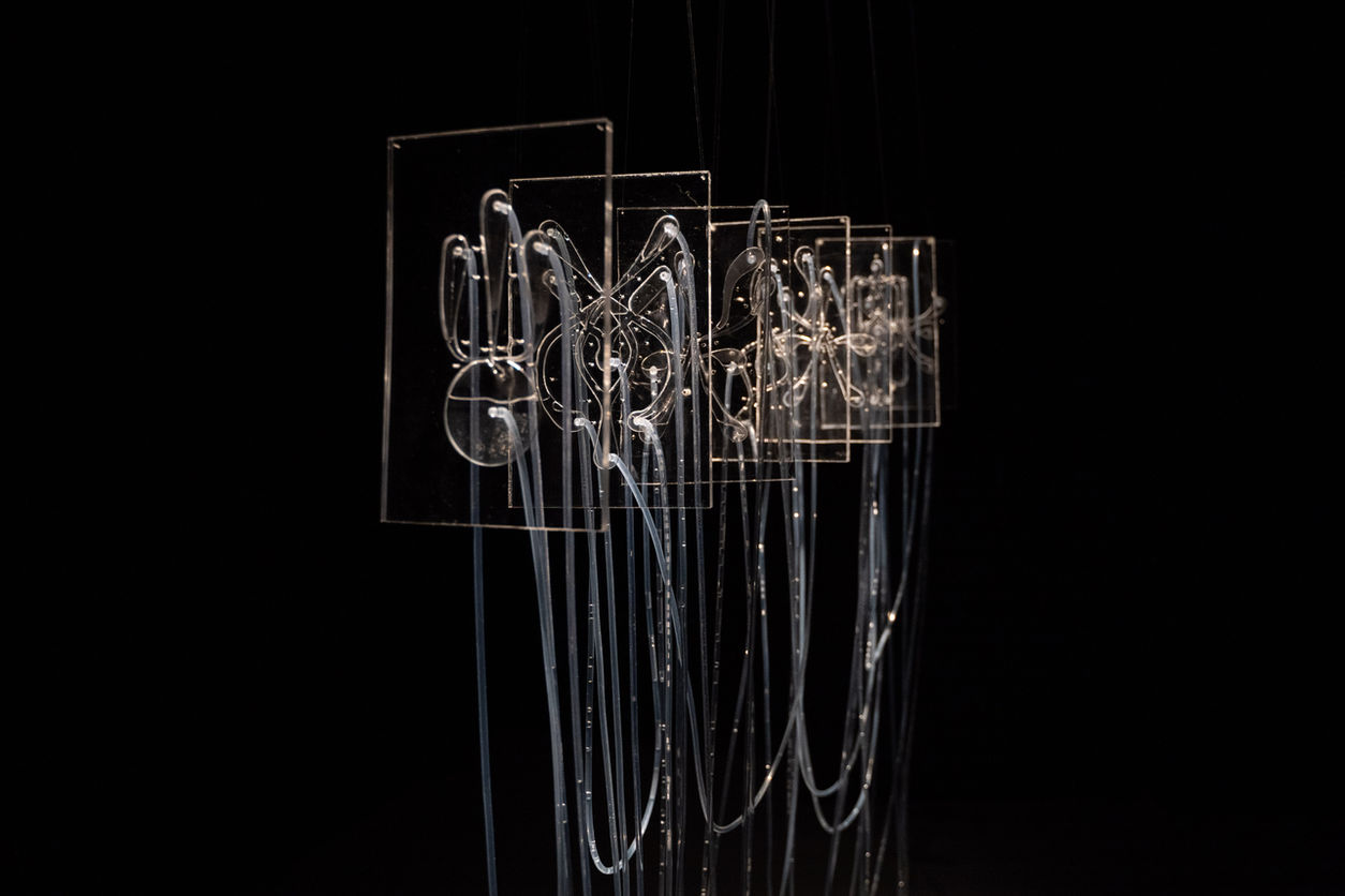 A transparent fluid sculptural circuit is forged in analogy to the inside bits of a contemporary computer. Components remodelled from historical patents and archives as curvaceous geometries, guide in their cavities streams of water.